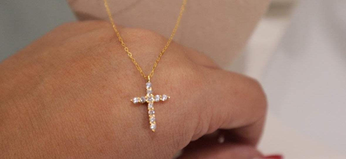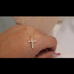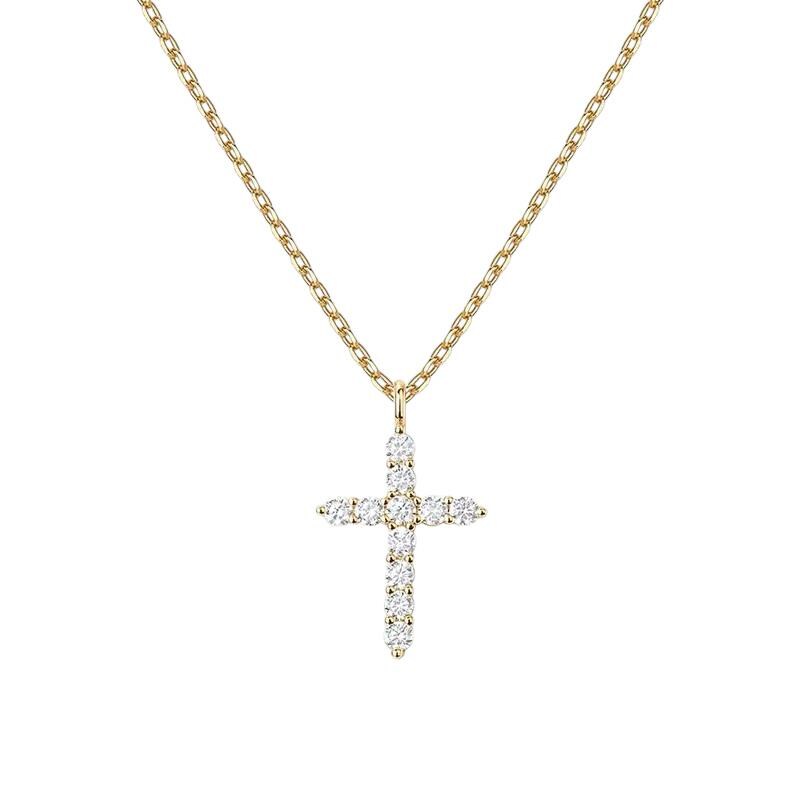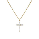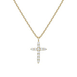 This necklace features a delicate cross pendant crafted with round-cut zircon stones, set in 18K gold-plated sterling silver. The cross is suspended from a fine, lightweight dainty gold chain that adds to its minimalist and elegant appeal.