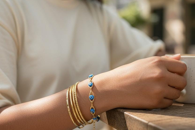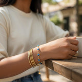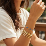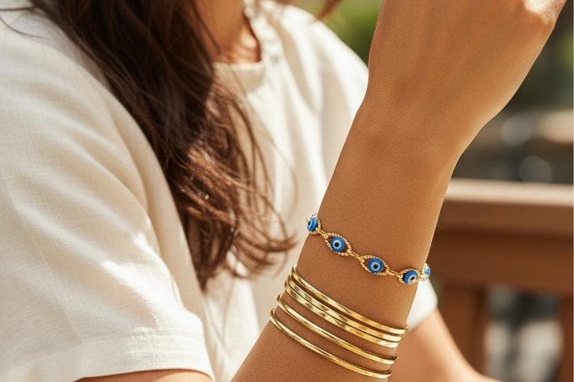 A timeless symbol of protection and style. This bracelet features brilliant blue evil eye charms set in a sleek twisted-link gold chain, believed to ward off negativity and attract good energy. Crafted with durable 14K gold-plated stainless steel, it’s waterproof, tarnish-resistant, and perfect for everyday wear. Layer it with your favorite bangles or wear it solo for a subtle yet powerful statement piece.