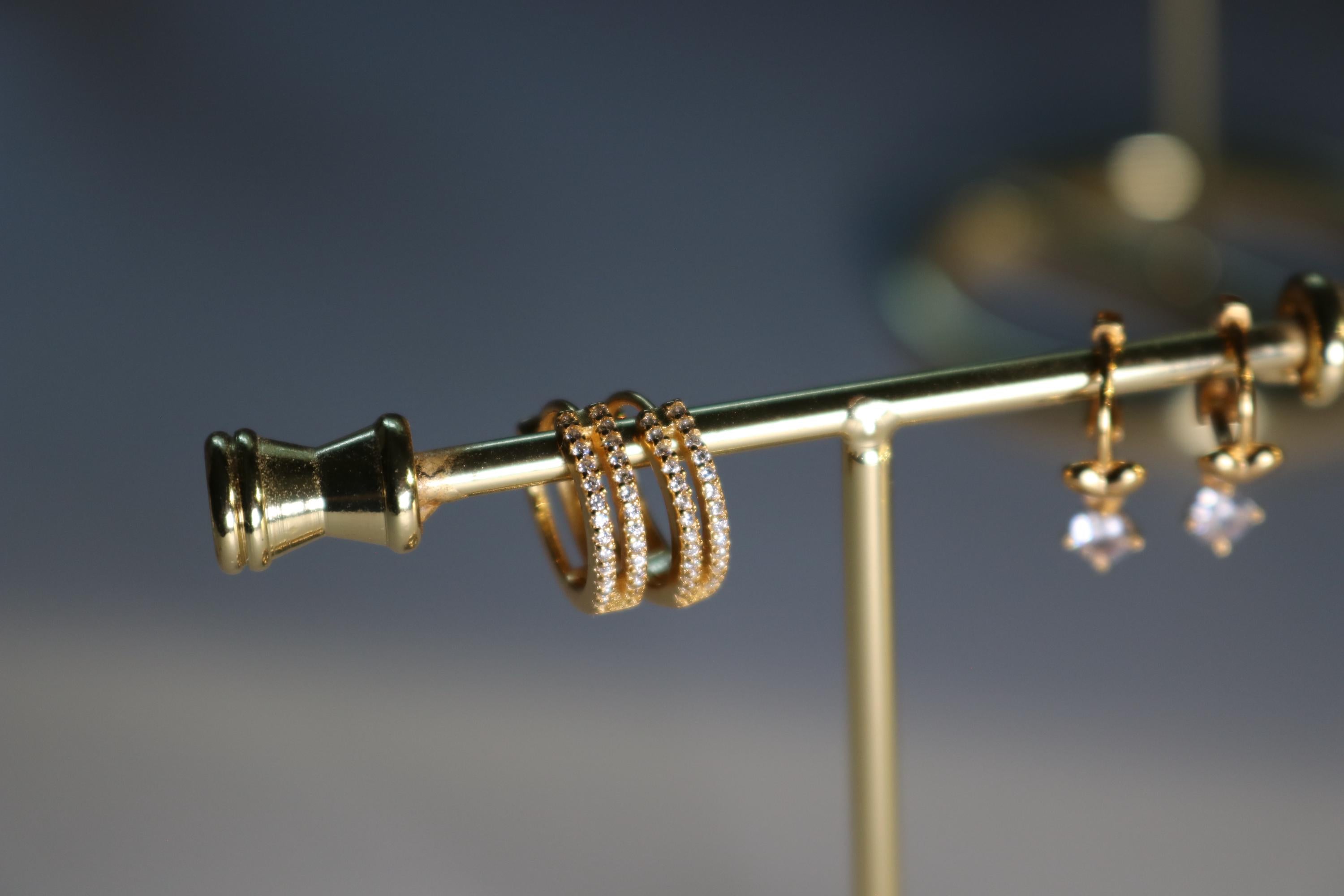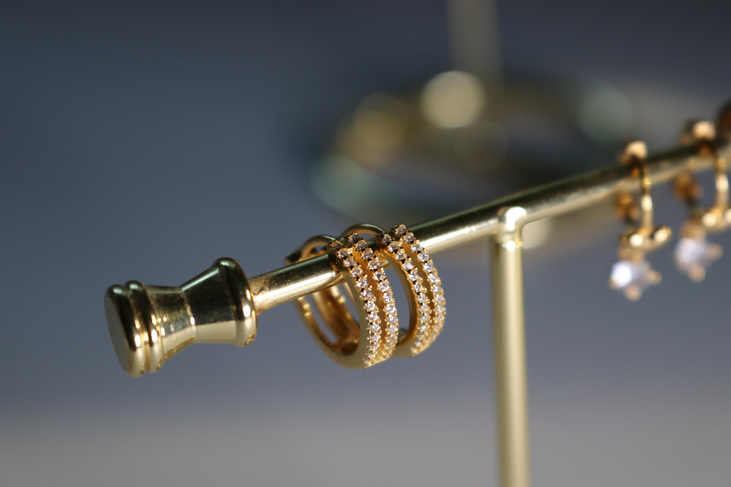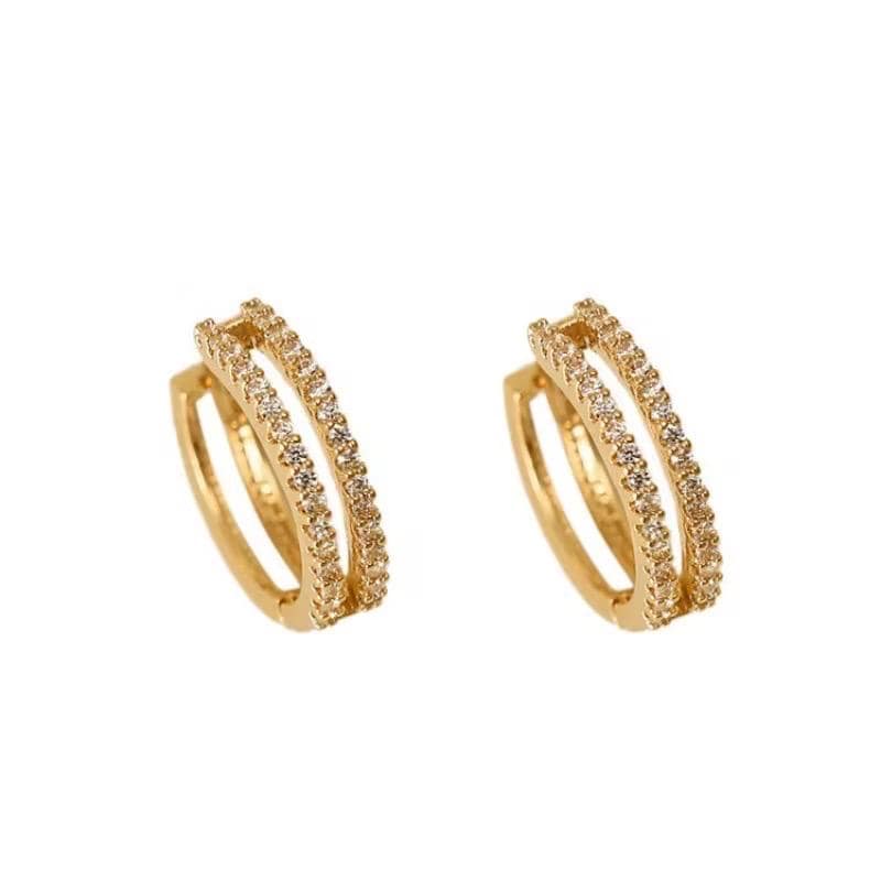 Chic and timeless, these gold double-row hoop earrings sparkle with cubic zirconia stones. Lightweight and versatile, they’re perfect for everyday wear or adding a touch of elegance to any occasion. Perfect for stacking or stand alone.